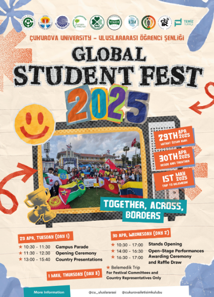Çukurova Üniversitesinde ilk defa düzenlenecek olan Uluslararası Öğrenci Şenliği 2025 (Global Student Fest 2025) 29 Nisan – 1 Mayıs 2025 tarihleri arasında katılımcılarıyla tanışmaya hazırlanıyor.