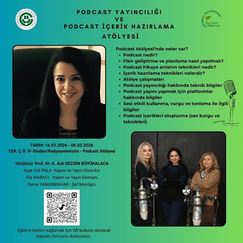 Ç.Ü. İletişim Fakültesi Dekanı Prof. Dr. A. Aslı Sezgin Büyükalaca' nın yürütücülüğünü yaptığı Podcast Yayıncılığı ve Podcast İçerik Hazırlama Eğitimi başlıyor. Eğitime İletişim Fakültesi öğrencileri başvurabilir. Eğitime katılım sağlamak için afişteki Qr kodunu okutarak başvuru formunu doldurmanız gerekmektedir. Eğitim 16 Şubat - 6 Mart tarihleri arasında gerçekleşecektir.Başvuru formunu en geç 13 Şubat 2026 tarihine kadar göndermeniz gerekmektedir.