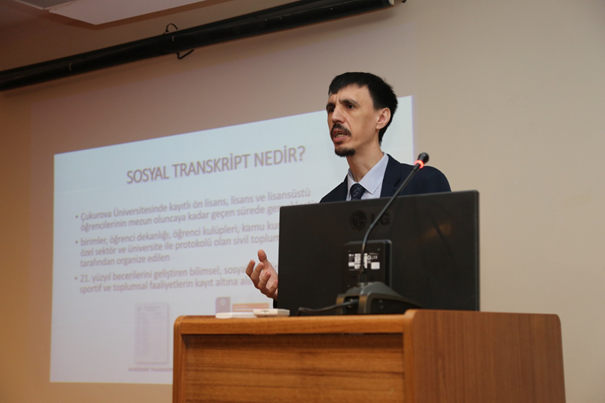 Çukurova Üniversitesi Öğrenci İşleri Daire Başkanı Azim Örneksoy ise Sosyal Transkript ile ilgili teknik olarak çeşitli bilgiler verdi. Sosyal transkript için ÇÜBİS (Çukurova Üniversitesi Öğrenci İşleri Bilgi Sistemi) üzerinden başvuru yapılacağını belirten Örneksoy, öğrencilerin ve danışmanların süreci takip etmesinin önemini vurguladı.
